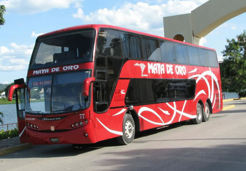 This is standard reclining seats Autobus for 45 passengers, Maya de oro, book tickets online to shuttle from Peten Flores Tikal to Guatemala city, best schedule to ride safe in north of the country.